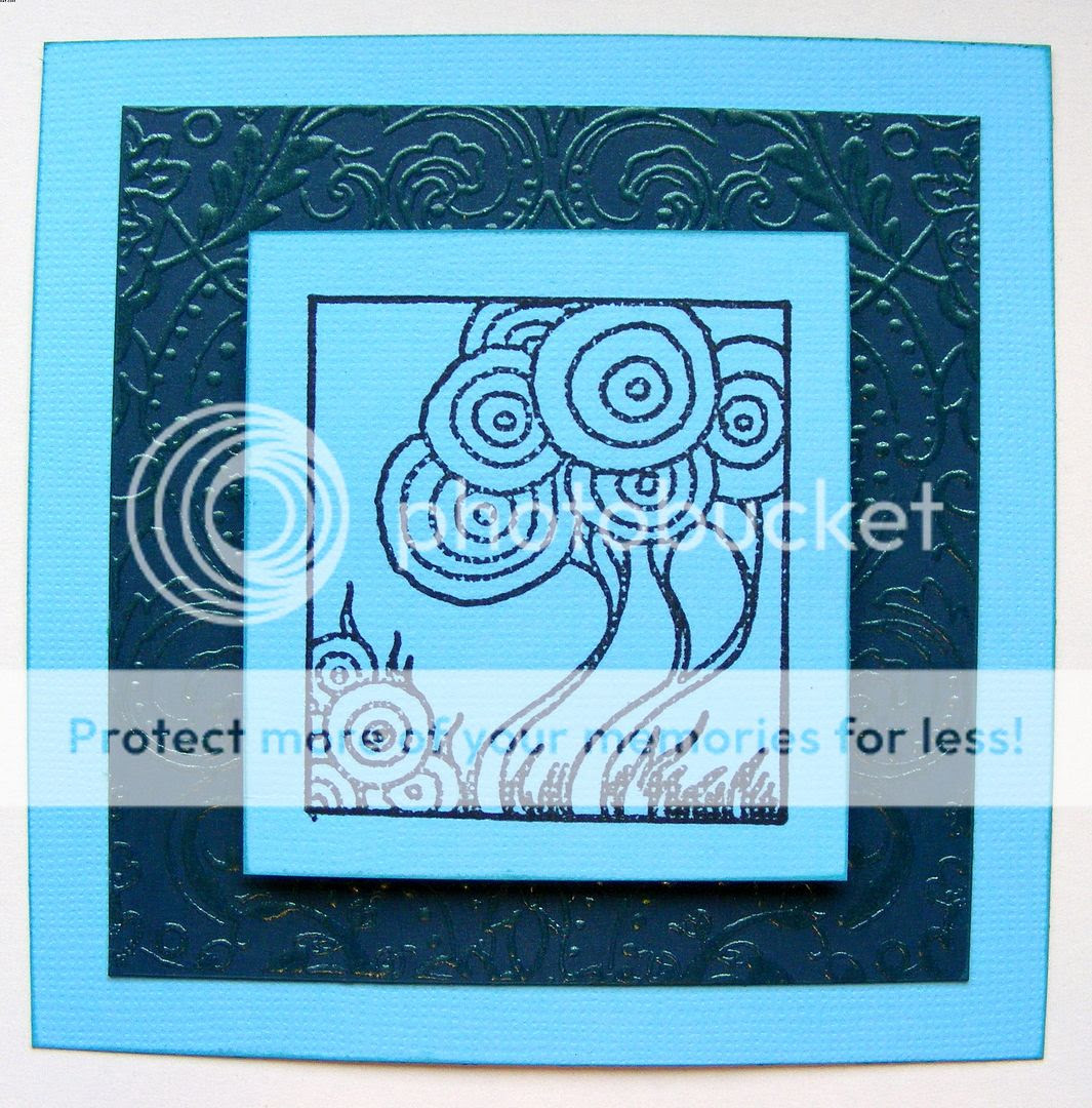 I used plain petrol blue card as the base and then stamped with Versamark ink using an All Night Media stamp (48362A) and heat embossed this with Moonglow desert moon turquoise embossing powder. I then trimmed this and matted the plate on some textured turquoise card which formed the base of the card. I then stamped a Clarice Cliff style stamp from Tanda stamps in onyx black Versafine ink on another square of turquoise textured card which was applied to the centre of the matt with foam pads. All edges were coloured with Colobox turquoise chalk ink.