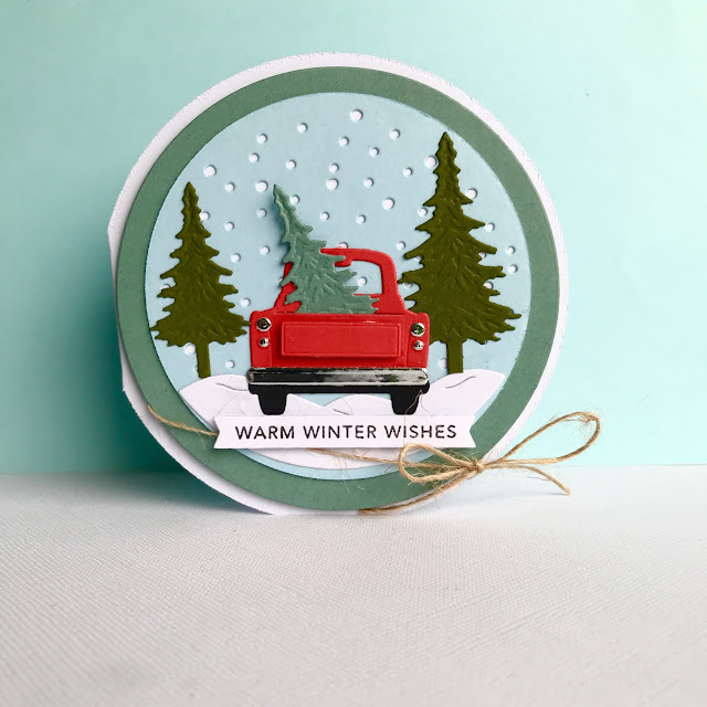 I used a set of dies by Spellbinders (Through the Woods) to cut the background, base, trees and truck from coloured and silver mirri cards.